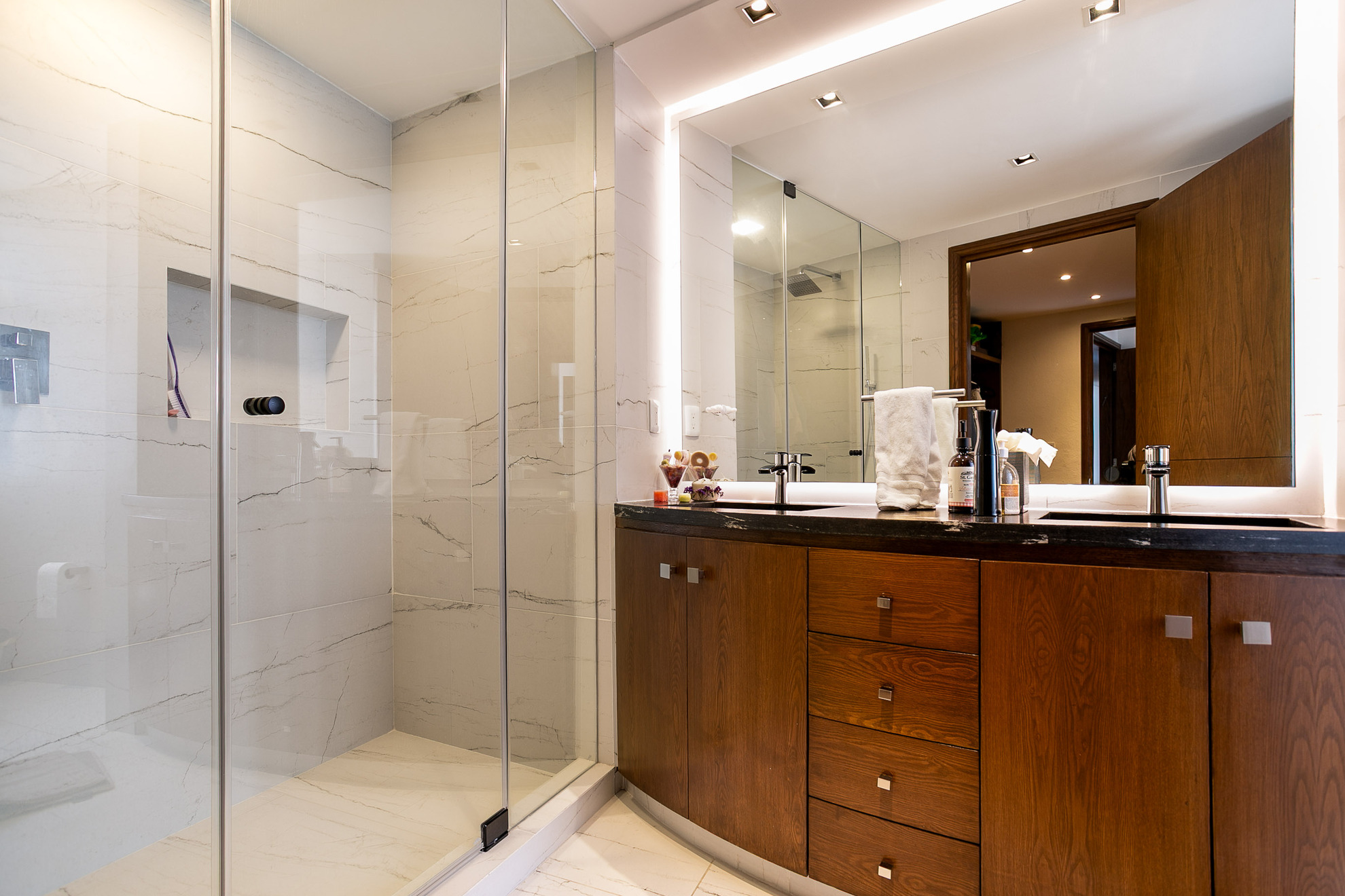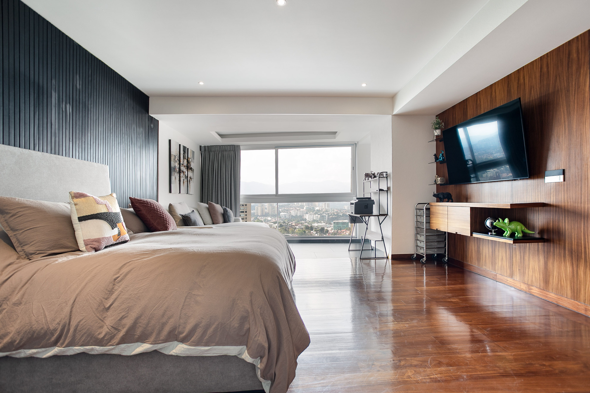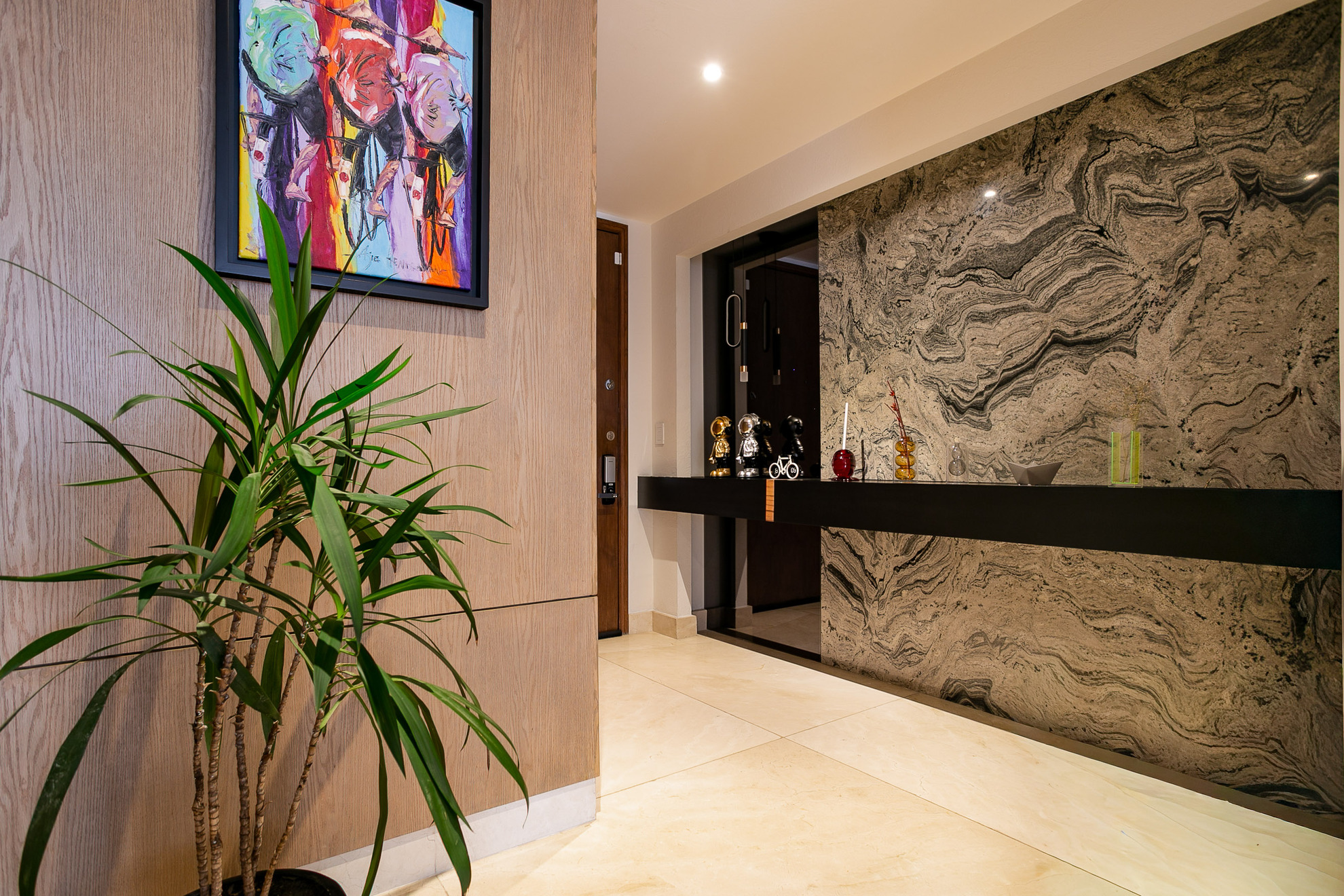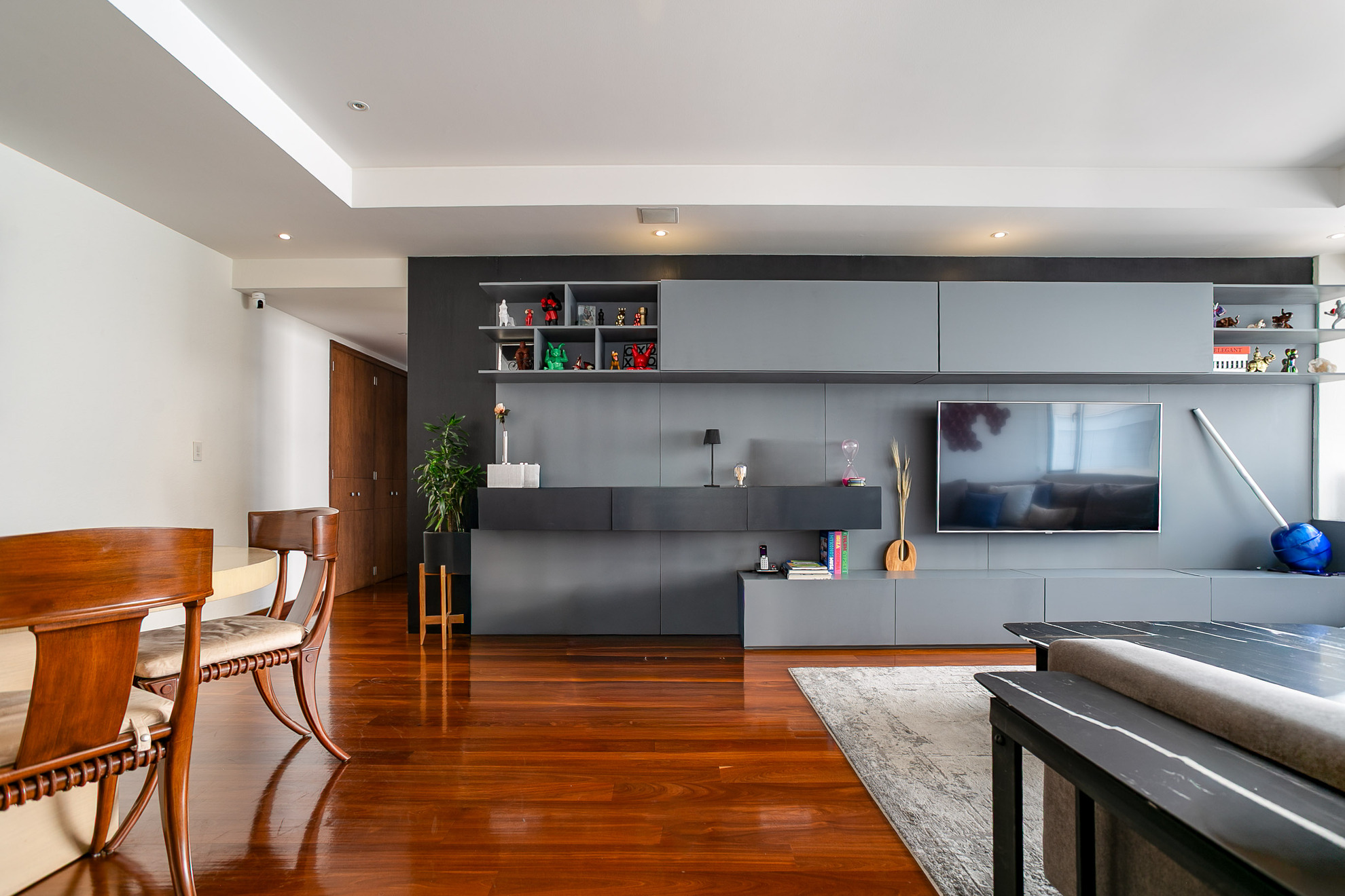 Un mueble de madera a medida funciona como área de almacenamiento y exhibición, aportando funcionalidad sin perder estética. Los acabados en madera, los tonos neutros y la iluminación empotrada en plafón logran un ambiente moderno, cálido y sofisticado.