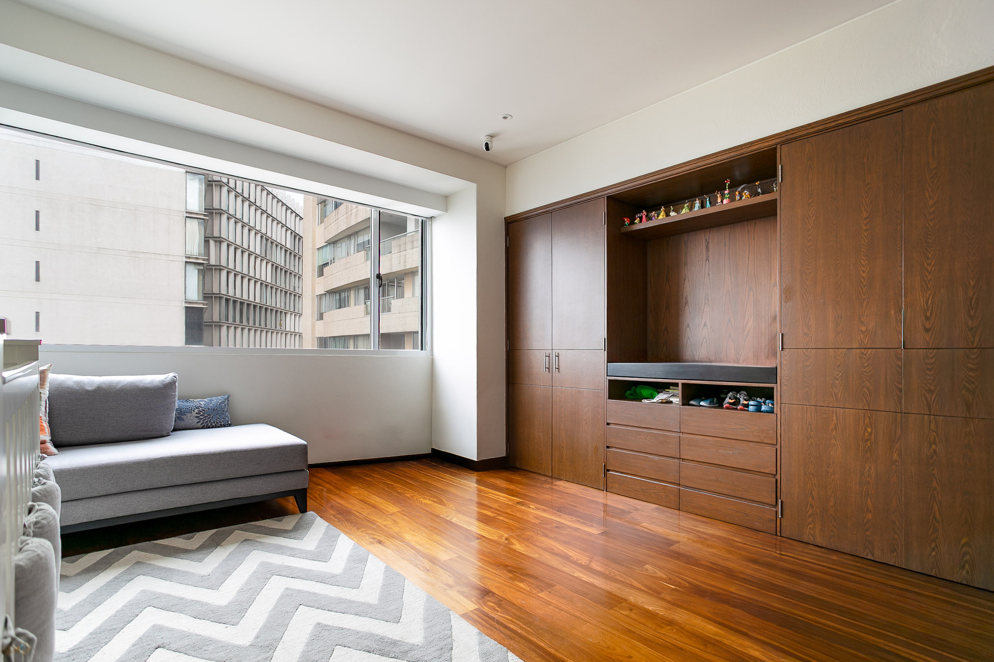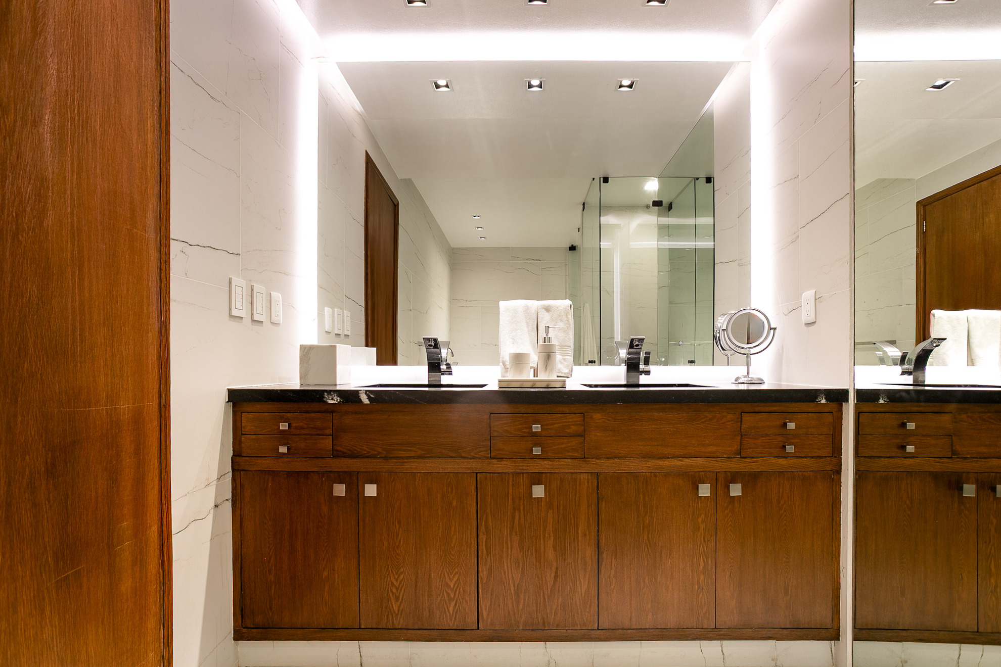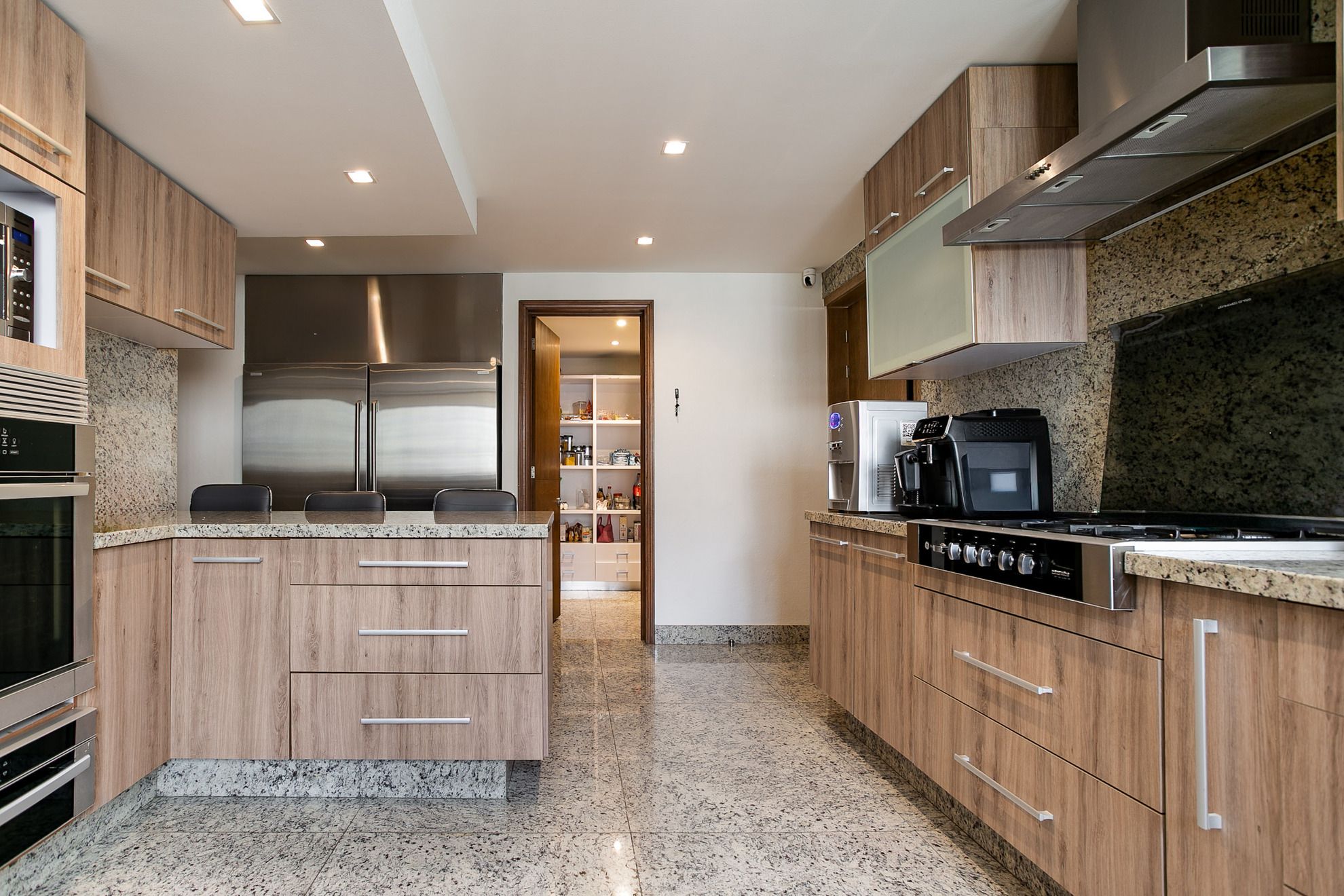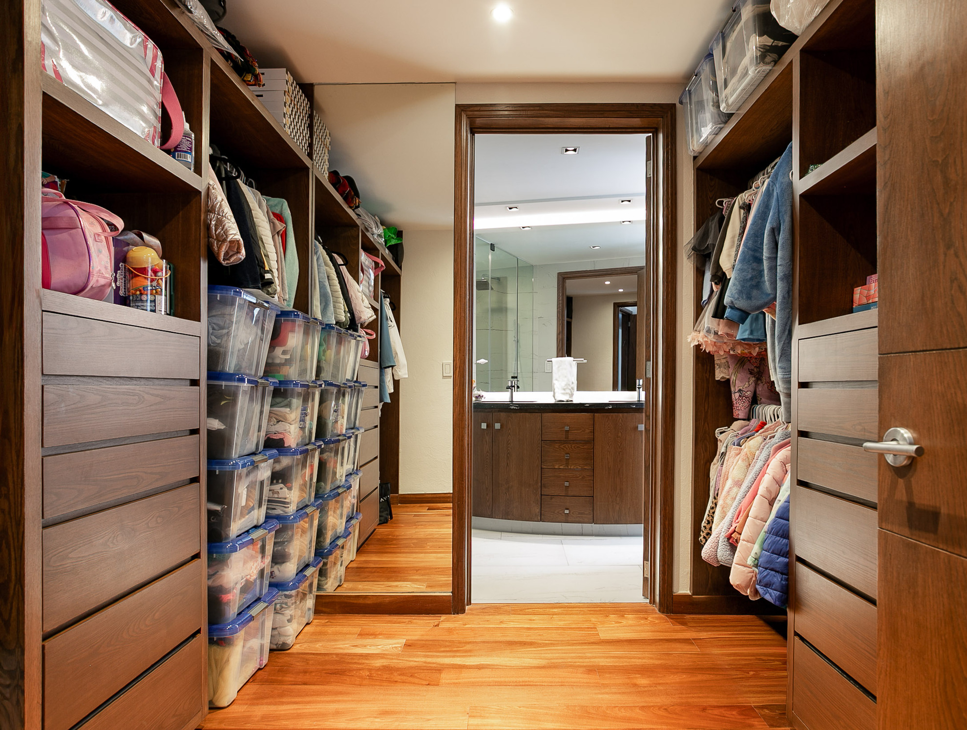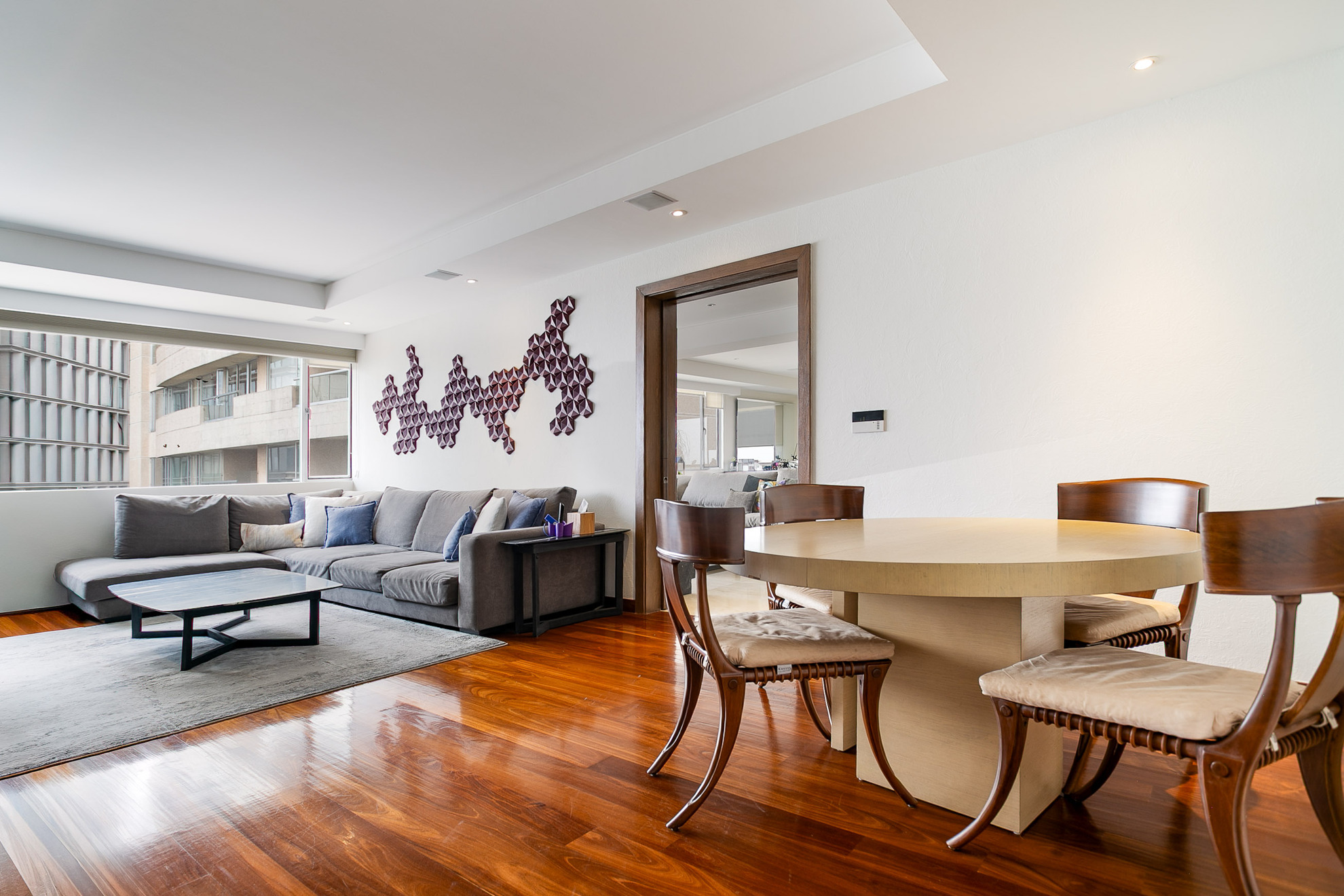 Un mueble de madera a medida funciona como área de almacenamiento y exhibición, aportando funcionalidad sin perder estética. Los acabados en madera, los tonos neutros y la iluminación empotrada en plafón logran un ambiente moderno, cálido y sofisticado.