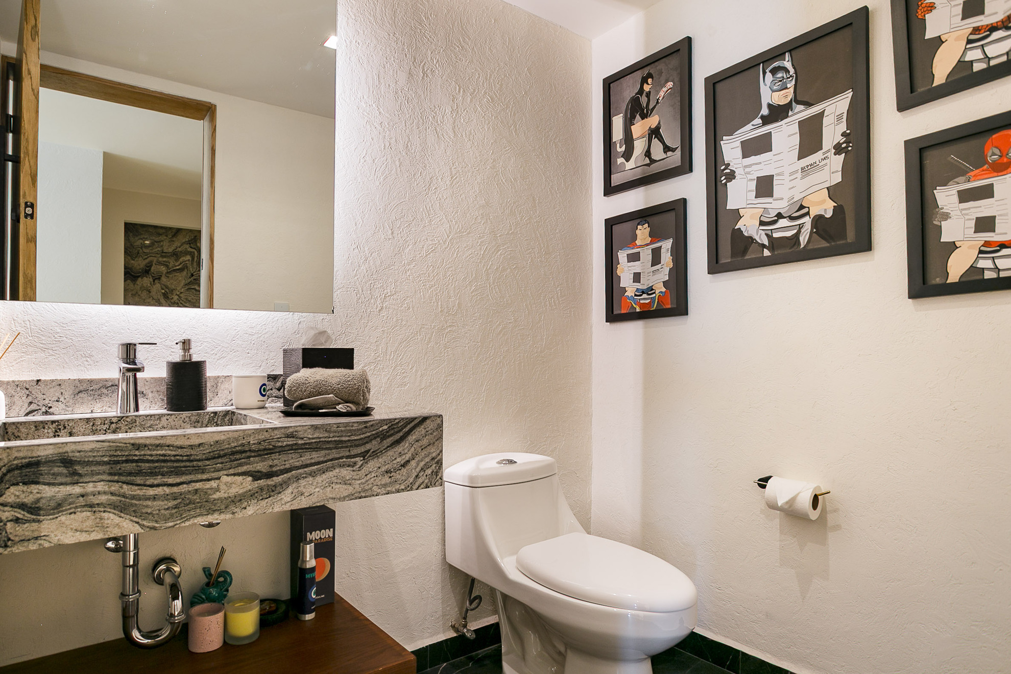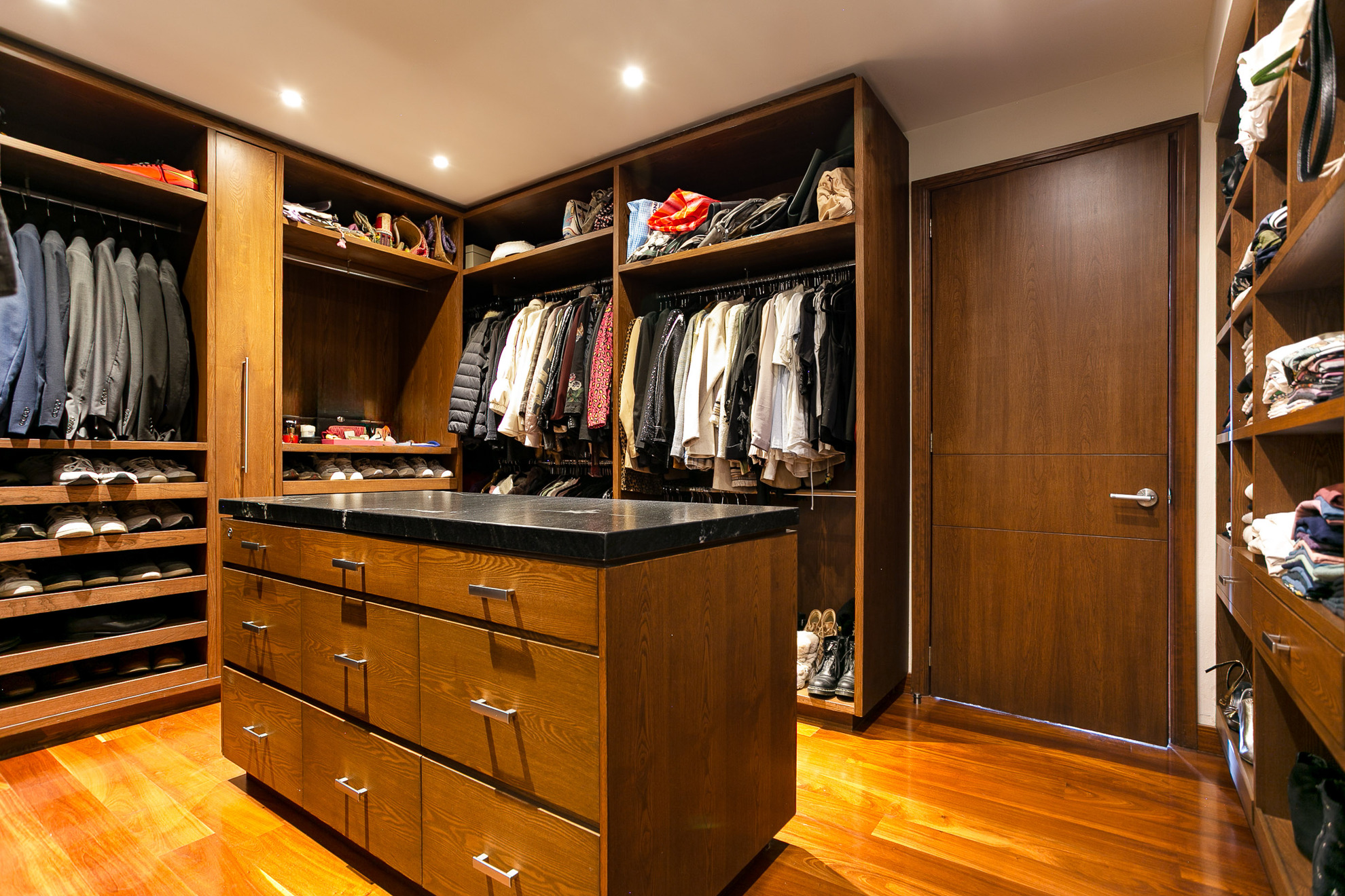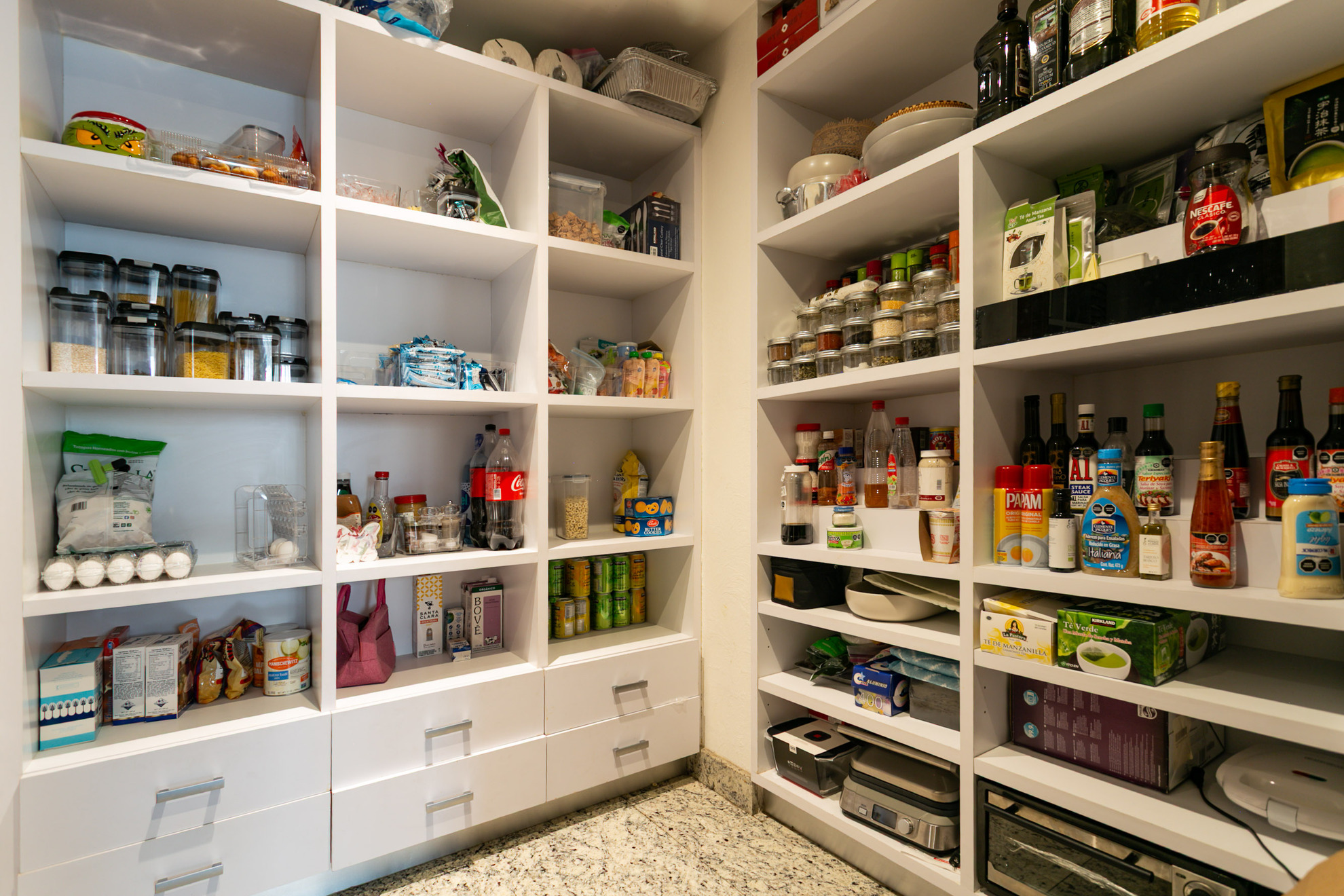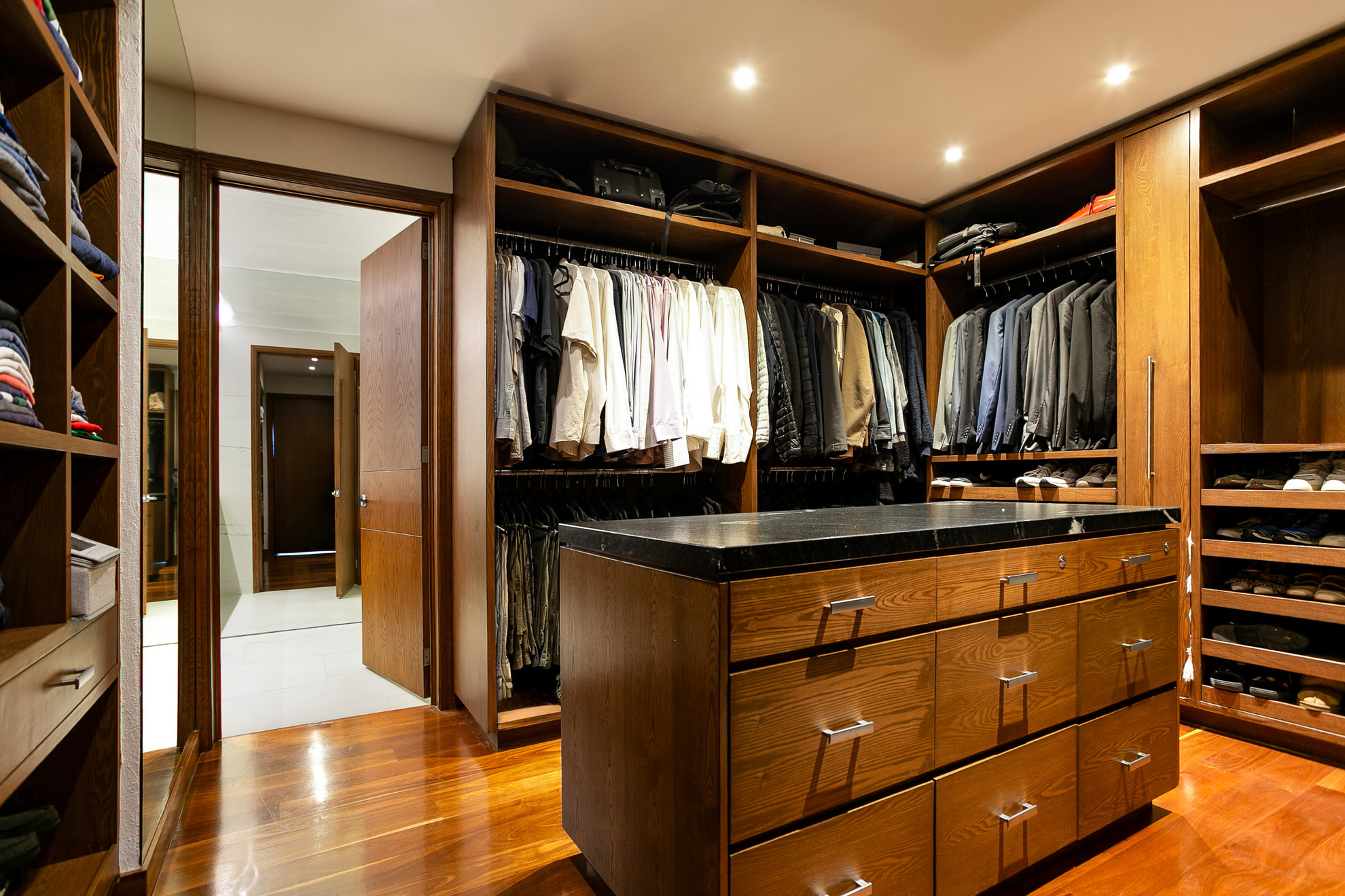 Un mueble de madera a medida funciona como área de almacenamiento y exhibición, aportando funcionalidad sin perder estética. Los acabados en madera, los tonos neutros y la iluminación empotrada en plafón logran un ambiente moderno, cálido y sofisticado.
