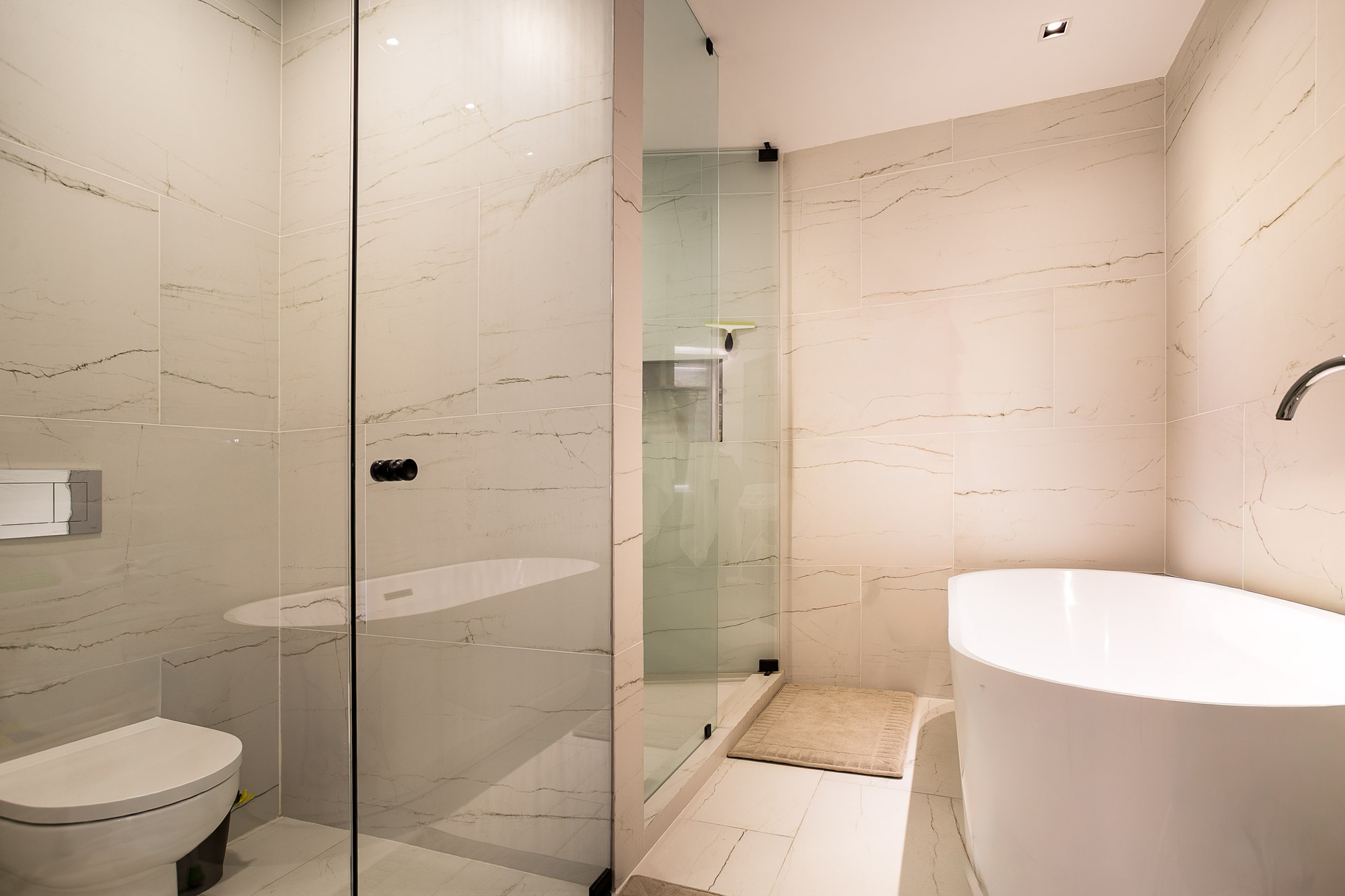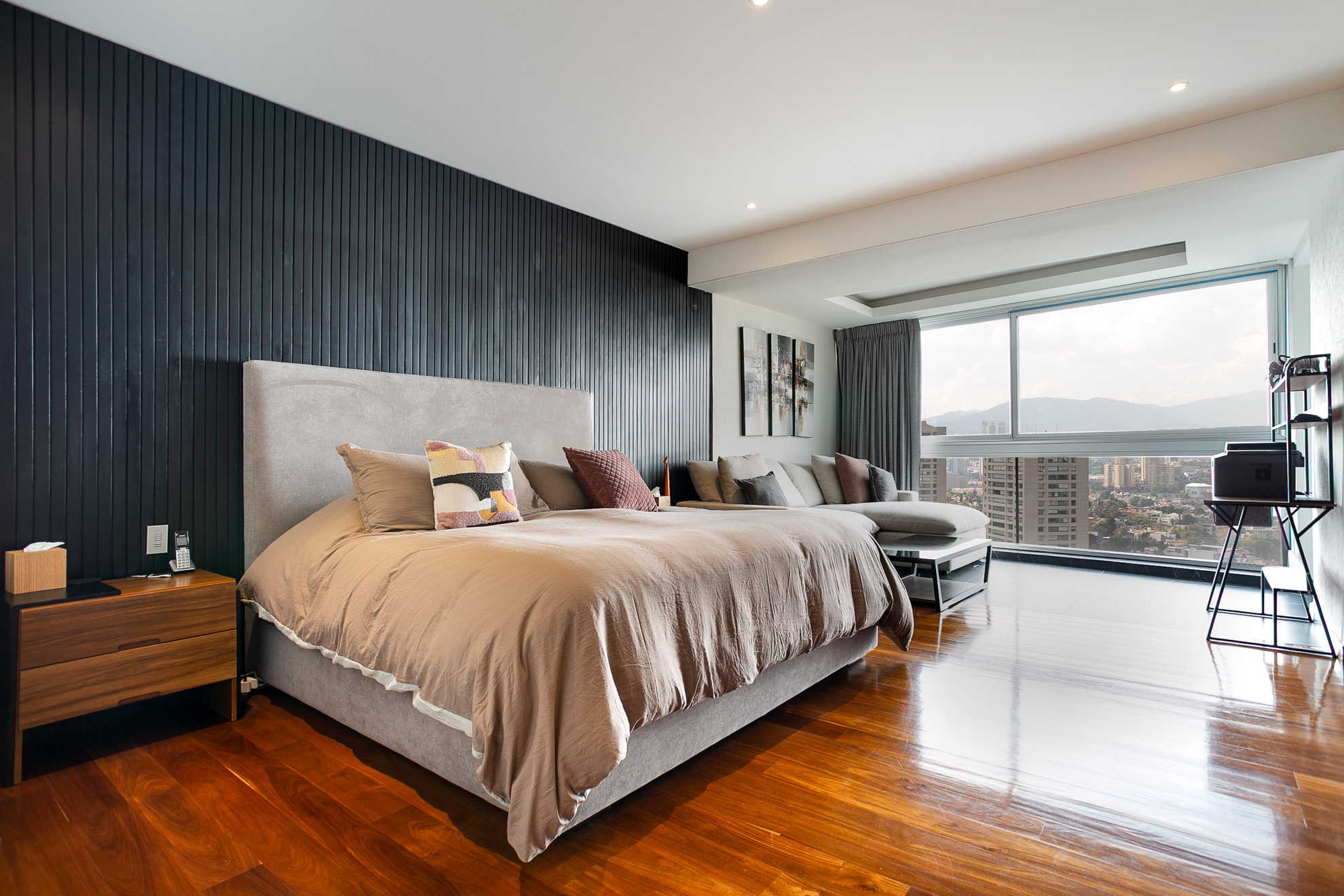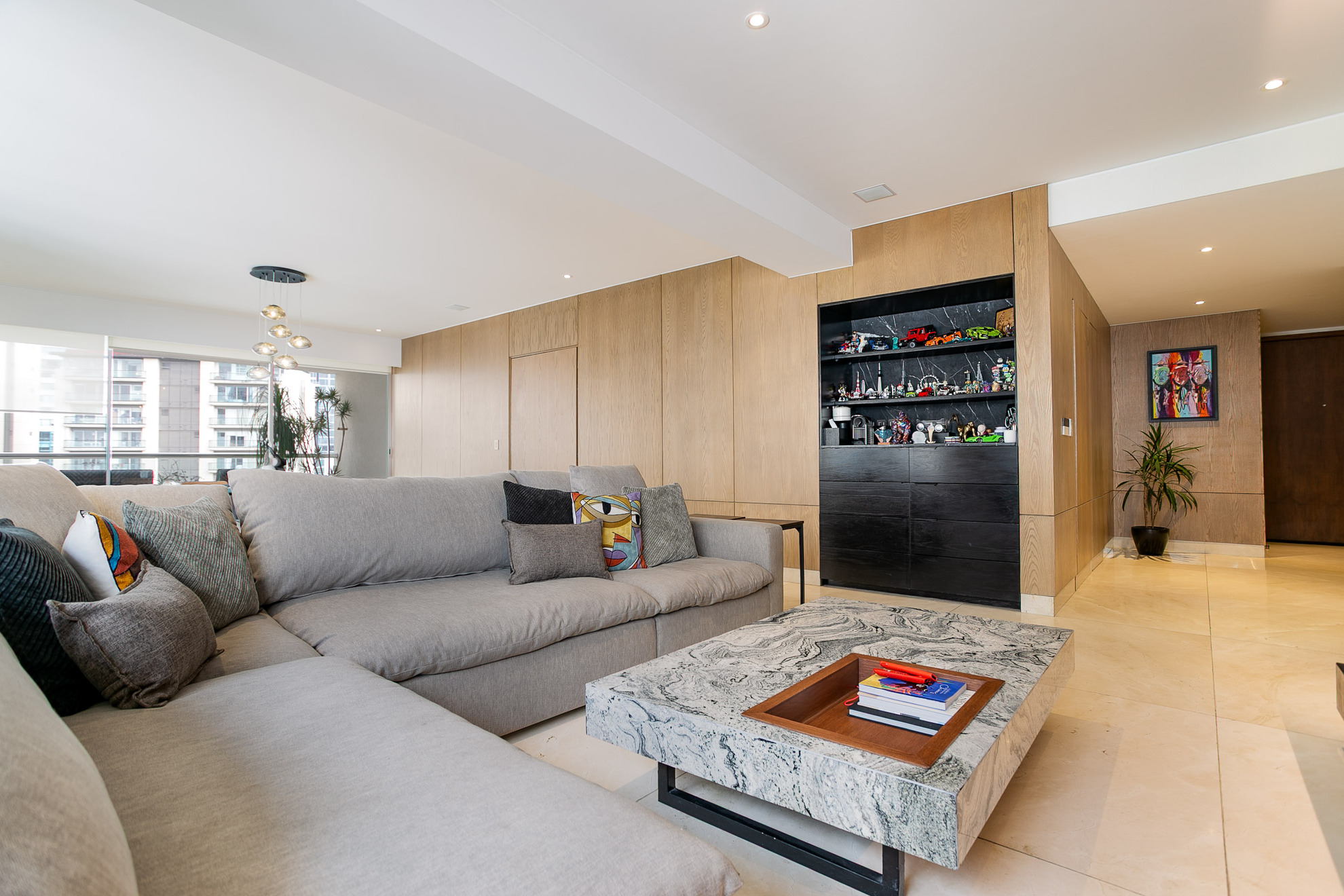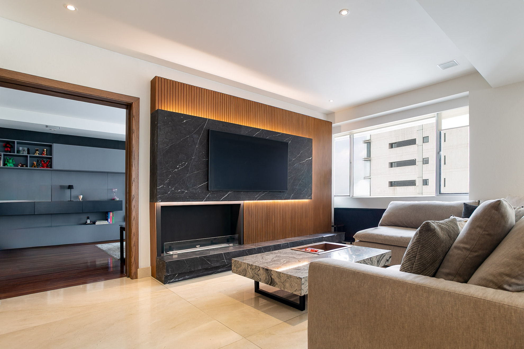La sala se integra de forma armoniosa al espacio, con un sofá de gran tamaño ideal para reuniones y descanso. El muro de TV con revestimiento en madera y mármol oscuro, además de iluminación indirecta, crea un ambiente acogedor y elegante.