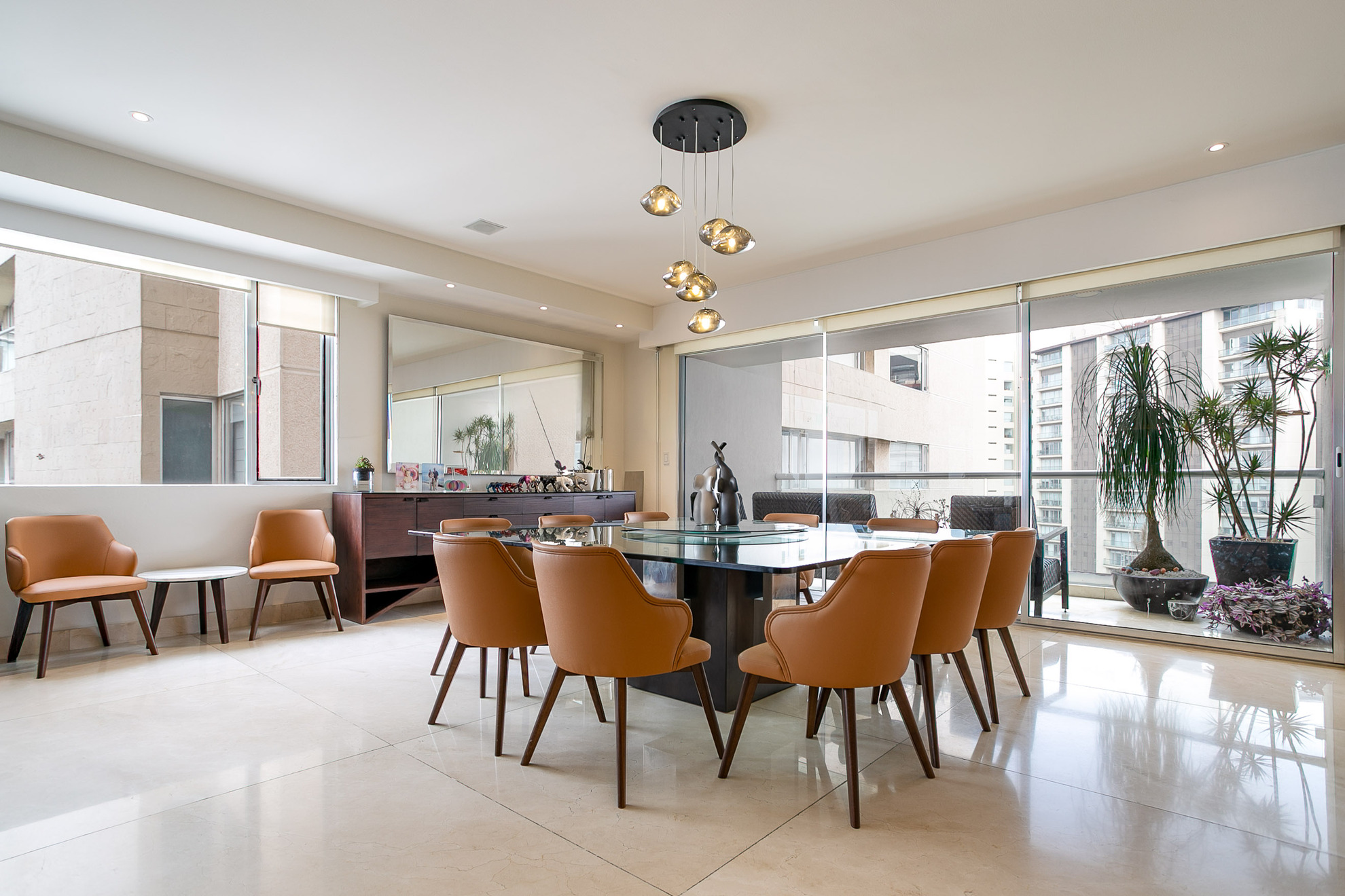 El comedor es amplio y sofisticado, con una mesa de cristal y sillas tapizadas en tonos cálidos que aportan confort y estilo. Sobre él, una luminaria colgante decorativa añade un toque contemporáneo y de diseño. El piso de mármol claro refuerza la sensación de amplitud y lujo.